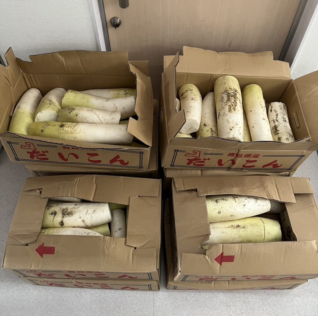六戸町の株式会社十文字商店様より大根10箱と里芋1箱、ブロッコリー、ほうれん草、しいたけを寄付していただきました。