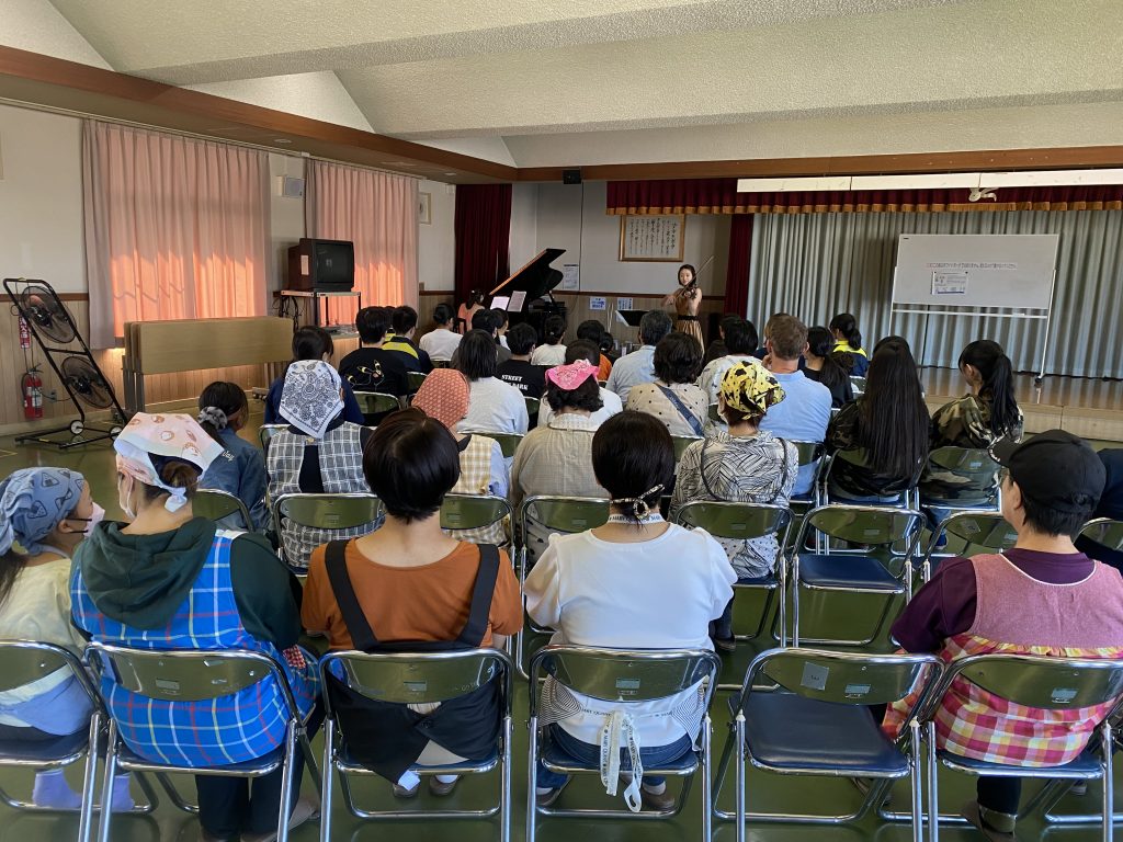 9/28(日)一般財団法人100万人のクラシックライブ様のご協力でバイオリンとピアノのクラシックライブを行いました。演奏家の高橋すみれさん(ヴァイオリン)と田名部栄里さん(ピアノ)はともに八戸市出身。ククラシックの名曲や大人から子どもまで誰でも一度は聞いたことがある「マツケンサンバⅡ」など地域の方も交え、生の音の迫力を感じながら演奏を楽しみました。