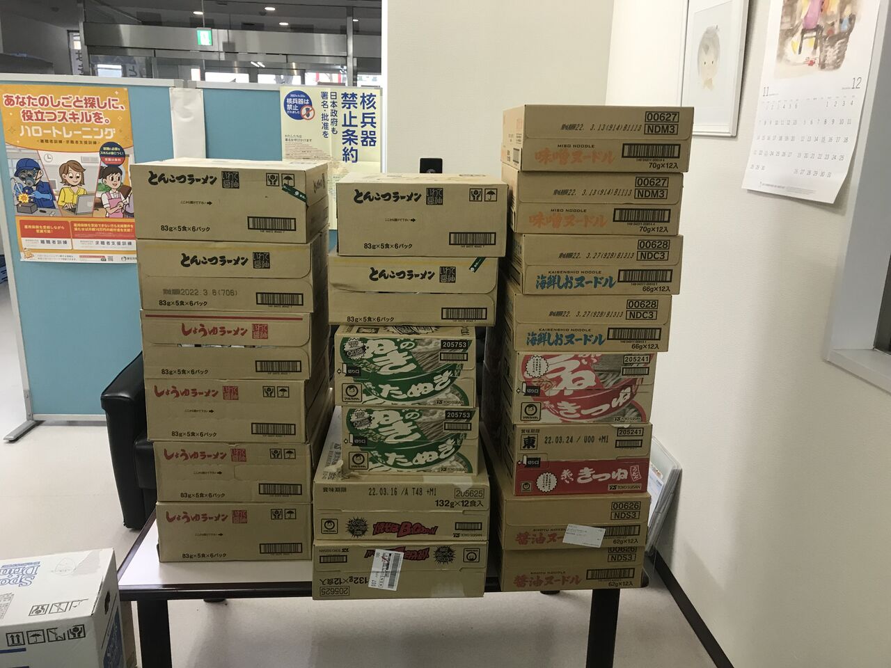12/15(水)市内在住の小橋様よりカップラーメン12箱、袋ラーメン8箱、うまい棒30本入り12袋、レトルトカレー5食入り25袋、パックご飯5食入り25袋、ソーセージ4本入り35個、レトルト麻婆茄子丼・そぼろ丼・中華丼計48袋を寄付していただきました。いつもご支援いただき、どうもありがとうございます!