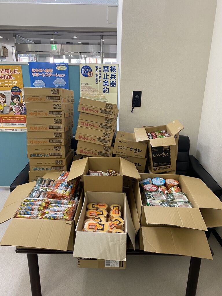 8/19(金)市内在住の小橋様よりカップ麺13箱、マンゴープリン2個入り25個、うまい棒30本入り9袋、レトルトカレー4食入り50袋、パックご飯3食入り50個を寄付していただきました。いつもご支援いただき、どうもありがとうございます!