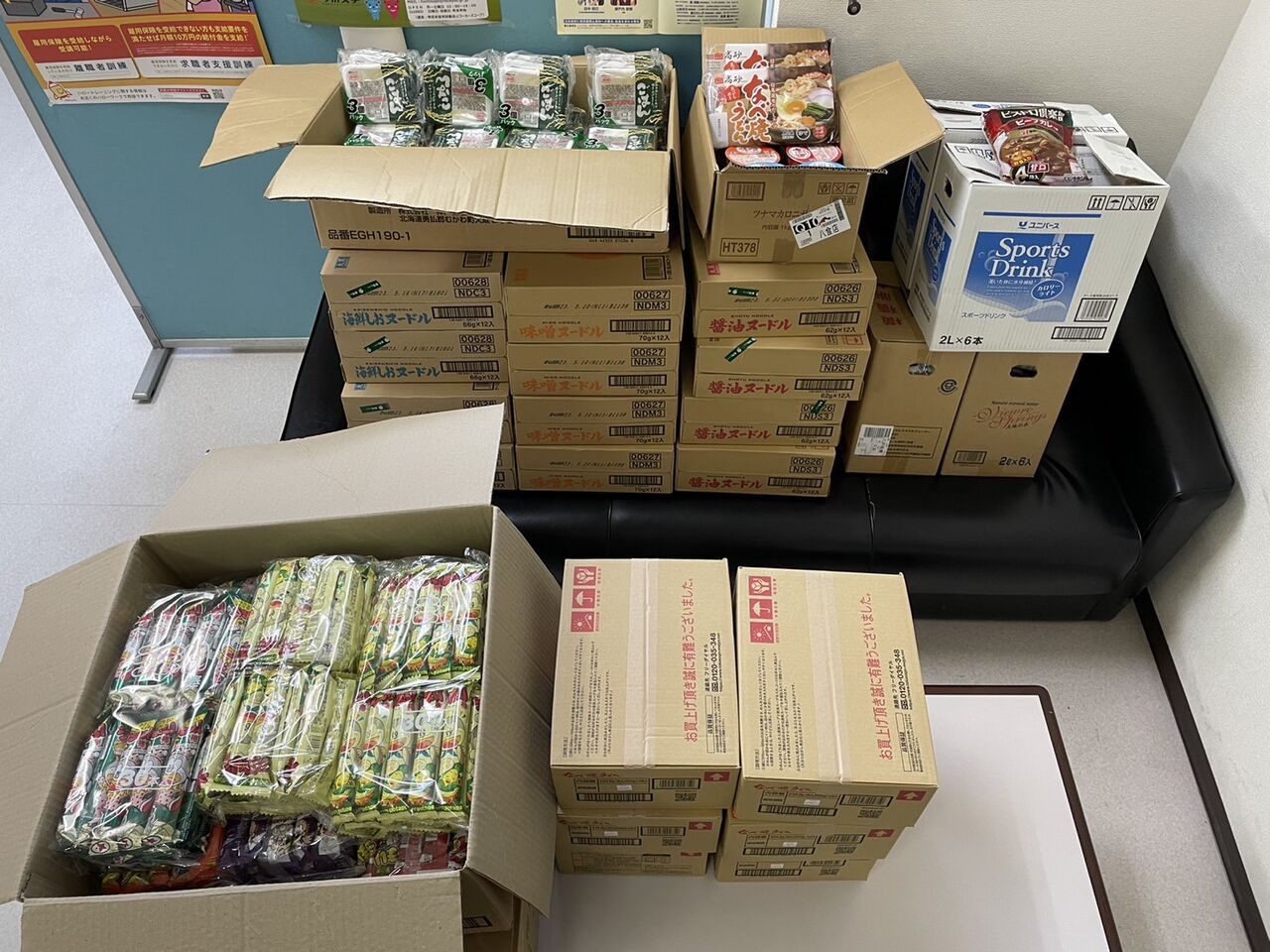 12/14(水)市内在住の小橋様より、カップラーメン12箱、なべ焼きうどん6箱、レトルトカレー4袋入り30袋、レトルトご飯3パック入り30袋、うまい棒30個入り8袋などをいただきました!いつもご支援いただきありがとうございます!