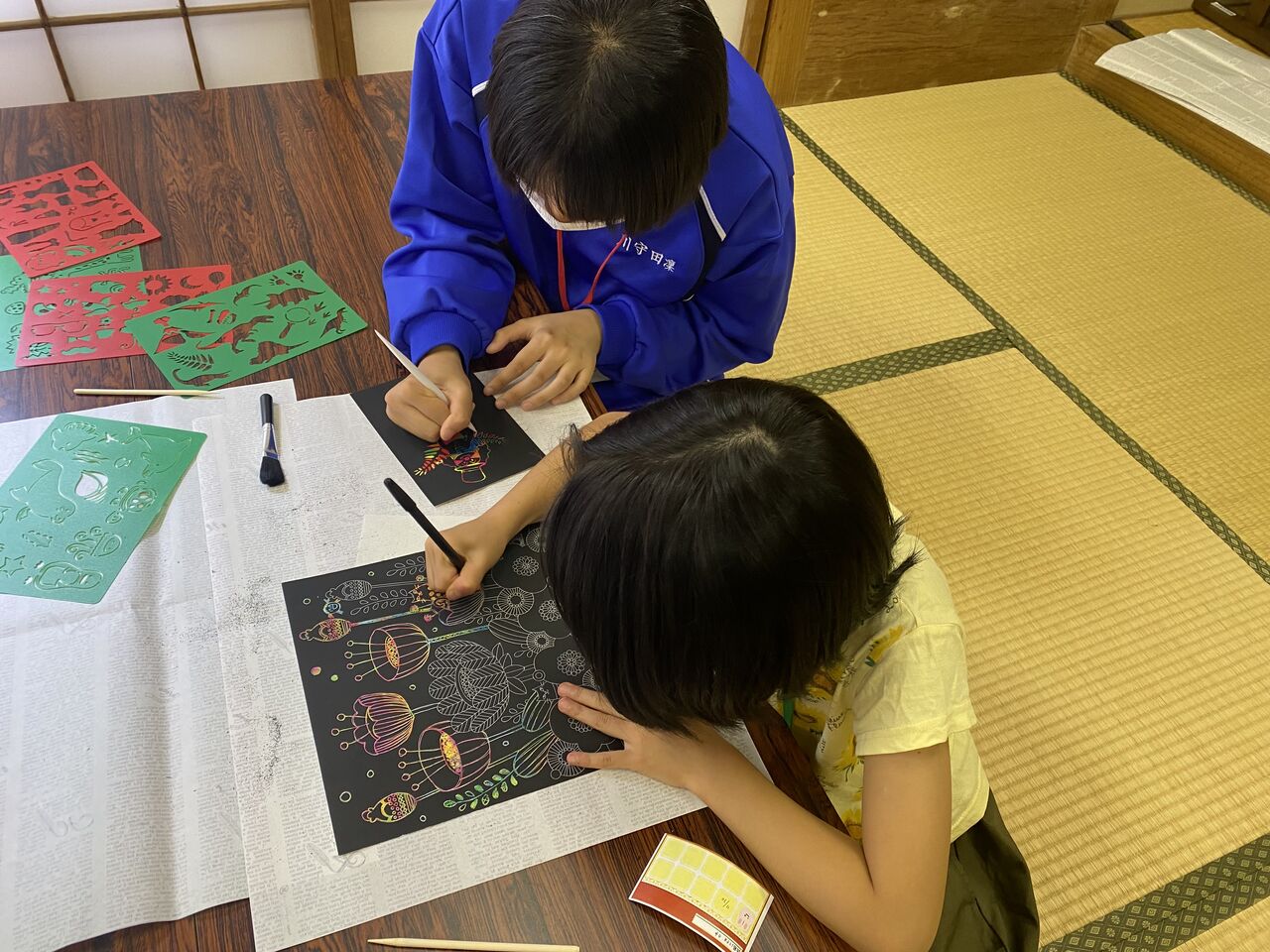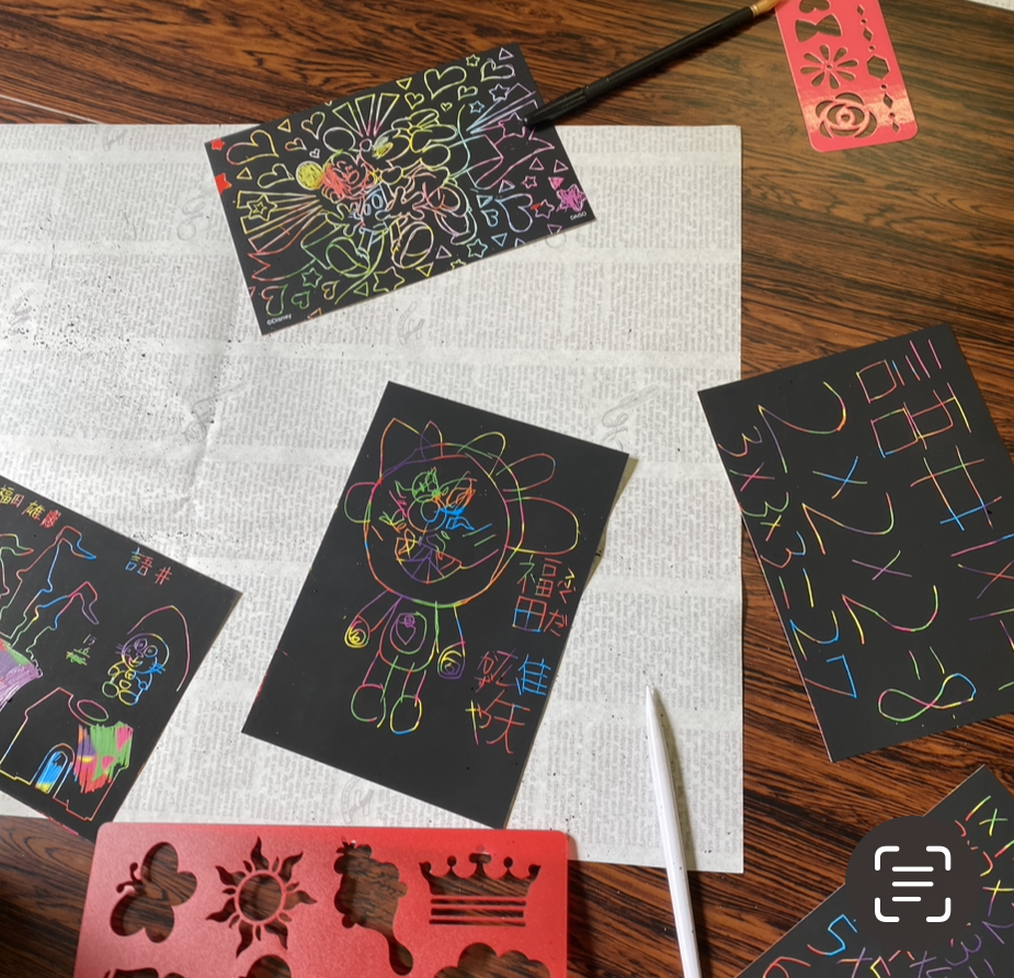 6/24(土)長者公民館で学習会プラスを行いました。勉強の後のお楽しみはスクラッチアート。白い線をなぞって削るとカラフルな色が出てきます。テンプレートを使ったり、自分でオリジナルの絵を描いたり・・・素敵なアートが出来上がりました。ボランティアで参加してくれた八戸工業大学第二高等学校の皆さんどうもありがとうございました。