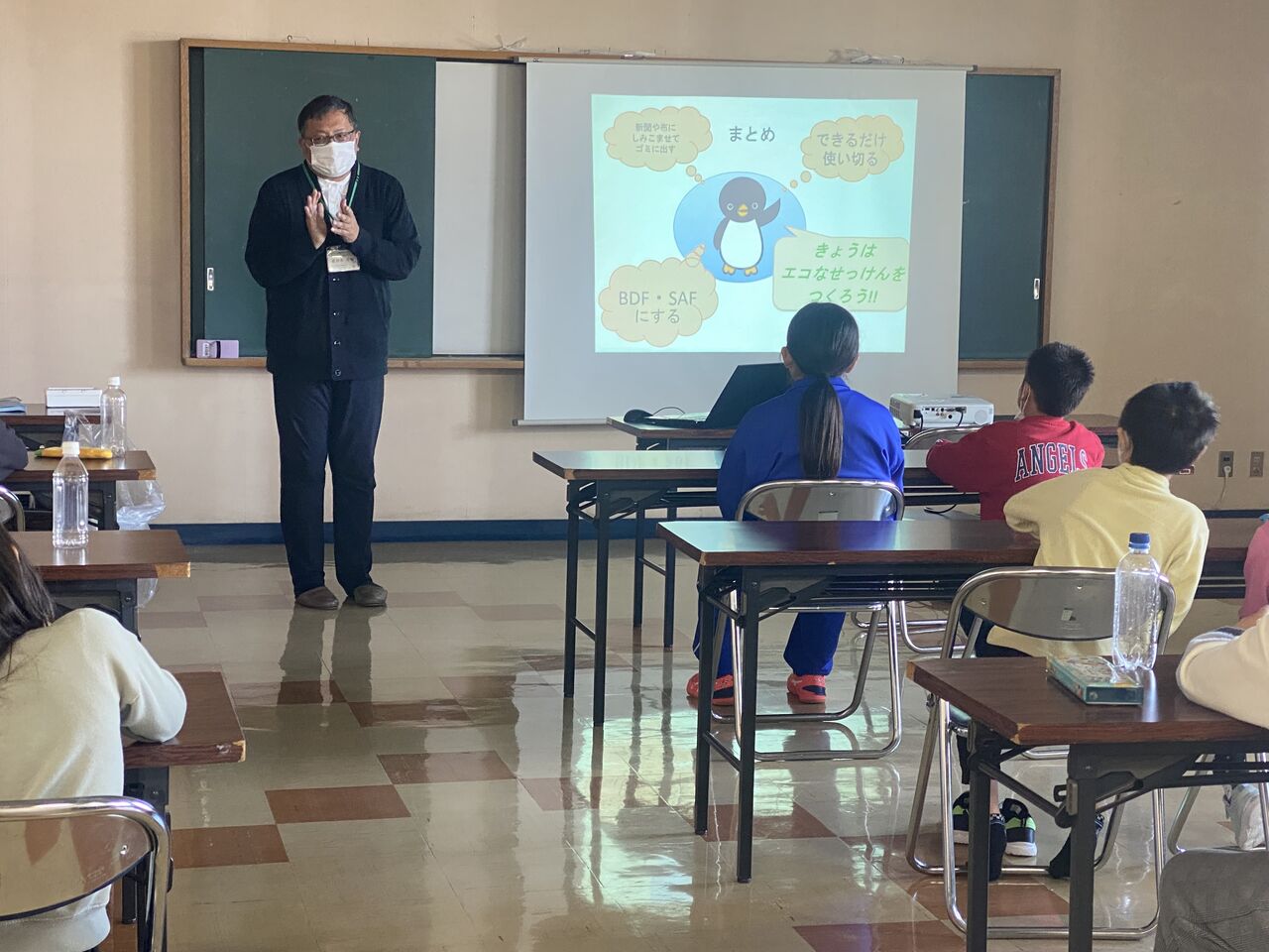 11/26(日)青森県環境パートナーシップセンター(AEPC)様のご協力で、小中学生を対象にした「かんきょう講座」を行いました。青森県地球温暖化防止活動推進員(アースレンジャー)の佐々木 氏が講師を務め、使⽤済み⾷⽤油の捨てる以外の活⽤⽅法や、3R についてわかりやすく教えていただきました。また、講座の後にはAEPCの工藤氏が廃油を使用したエコ石鹸の作り方を教えていただき、楽しい時間を過ごしました。ご協力いただいた皆様、どうもありがとうございました。 温暖化防止活動推進員(アースレンジャー)佐々木 秀智氏