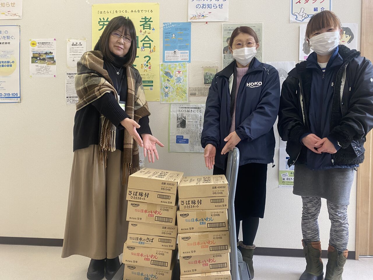 1/25(木)株式会社宝幸八戸工場様よりさばといわしの缶詰10箱を寄付していただきました。 缶詰は常温保存でき、手間いらずですぐに食べられるので毎回大好評です。 宝幸様ご支援いただきありがとうございました!