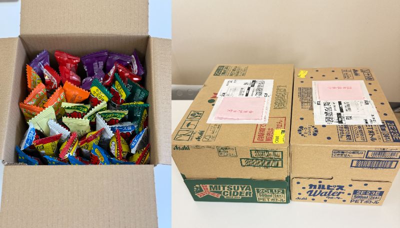 amazonみんなで応援プログラムを通して、コイズミ様様よりうまい棒40本、三ツ矢サイダー1箱、カルピス1箱を寄付していただきました。